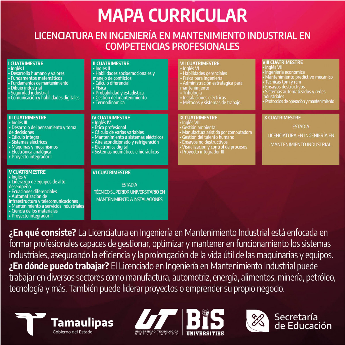 El Licenciado en Ingeniería en Mantenimiento Industrial podrá desempeñarse atendiendo los siguientes puestos de trabajo:
